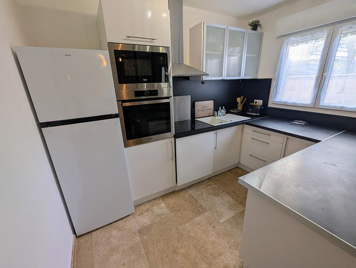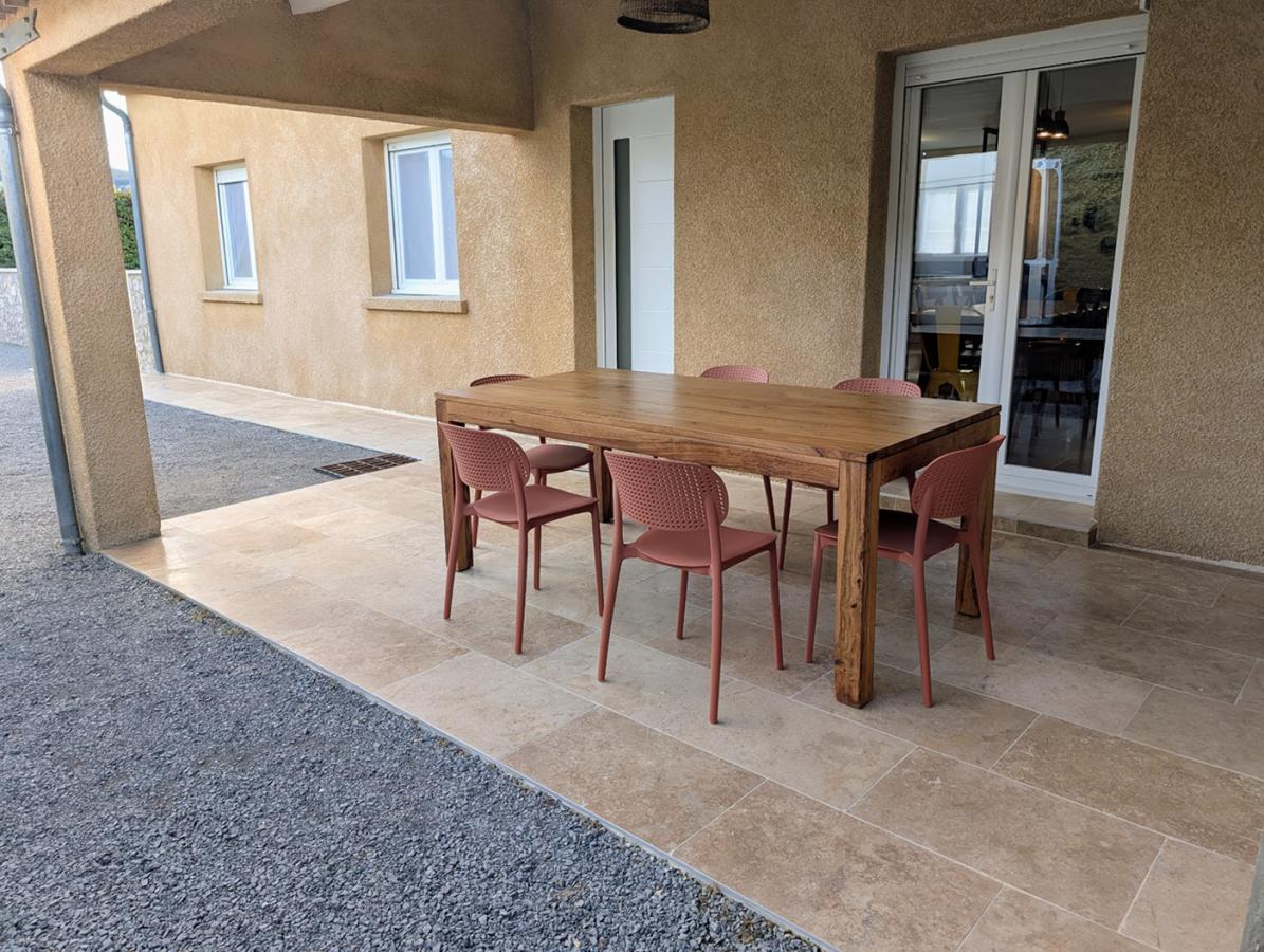 - Terrasse couverte en prolongement du séjour, avec grande table, 6 chaises, plancha électrique, porte-fenêtre avec store roulant électrique