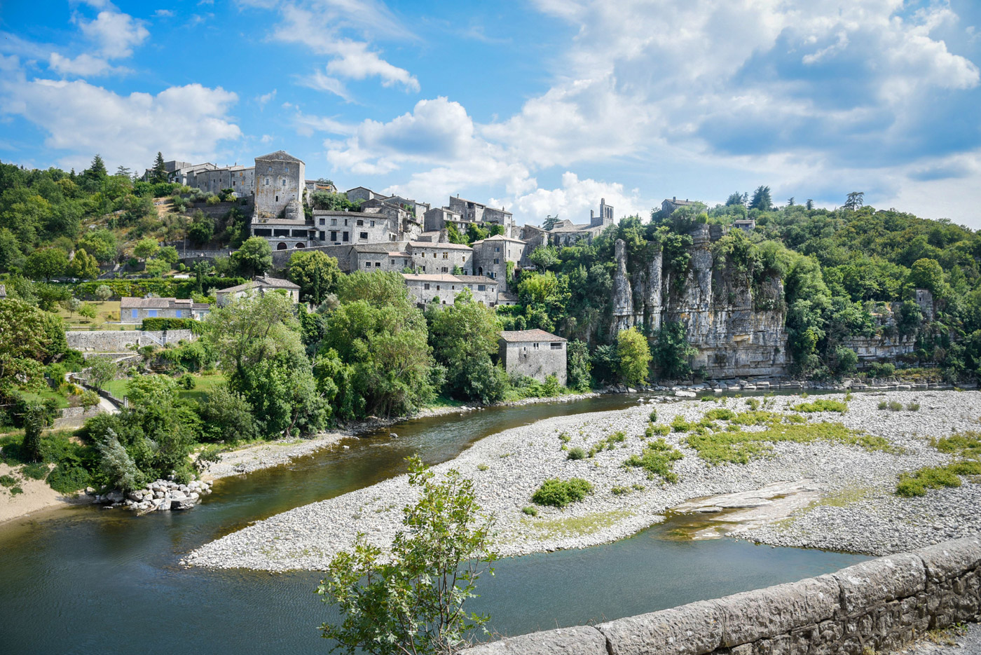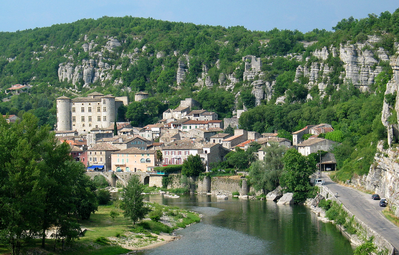 Village posé contre des falaises de calcaire, au bord de la rivière La Beaume (et près de l’Ardèche).